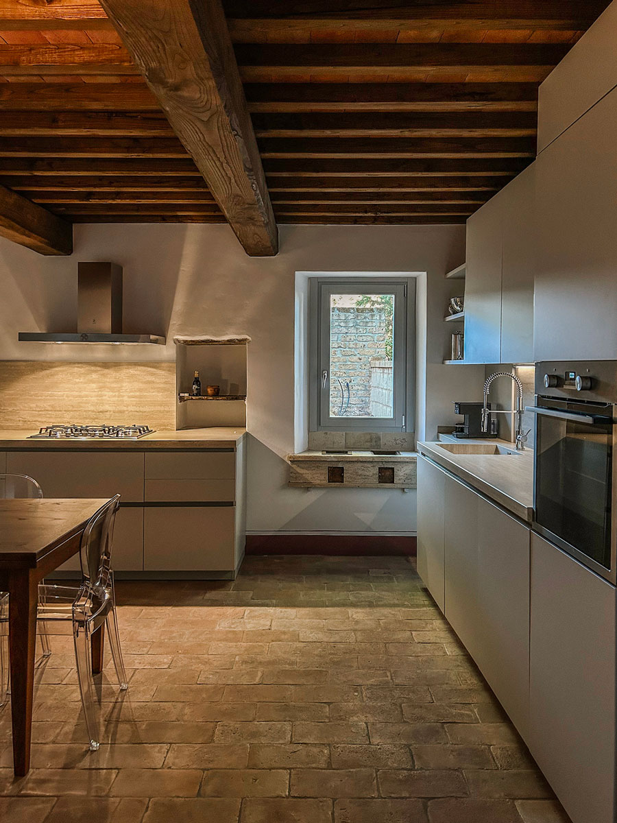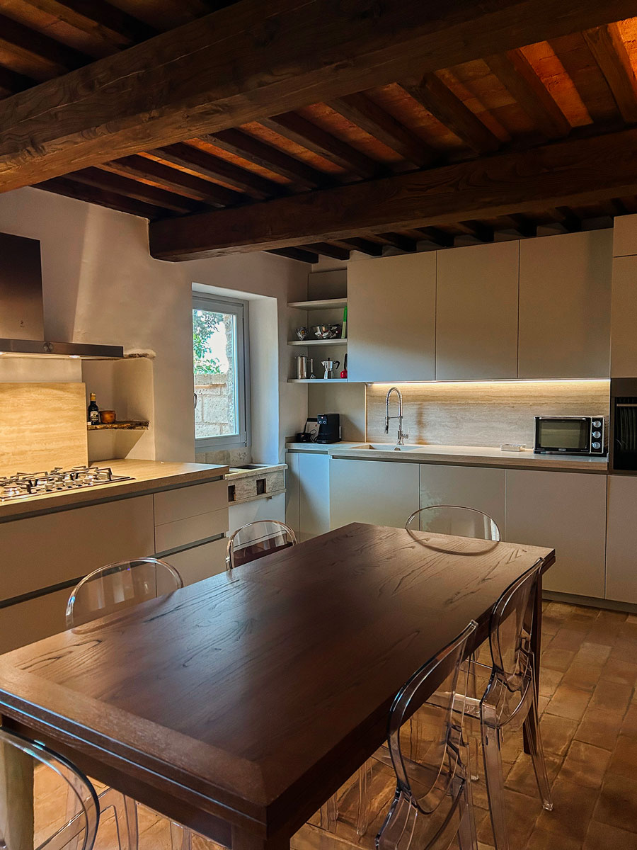 • Cucina: Progettata da Forma Cucine, color tortora con un top bordeaux e un’isola centrale in legno, che unisce estetica e funzionalità.