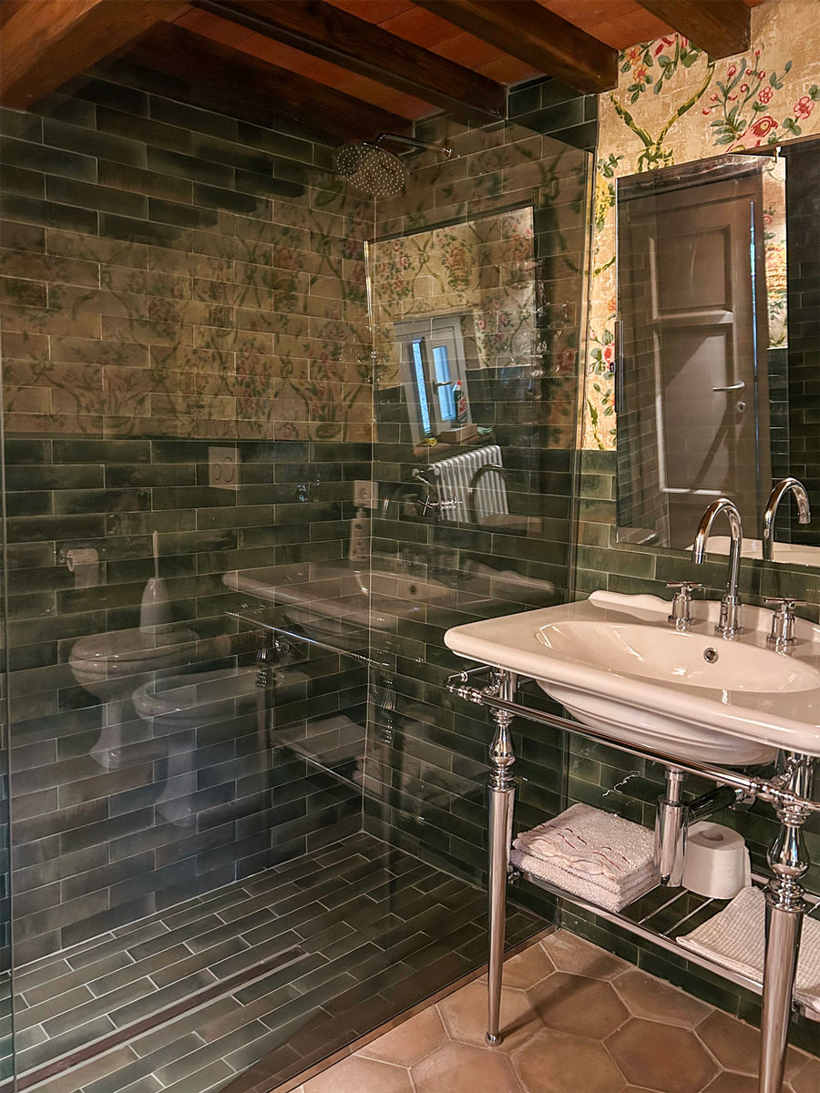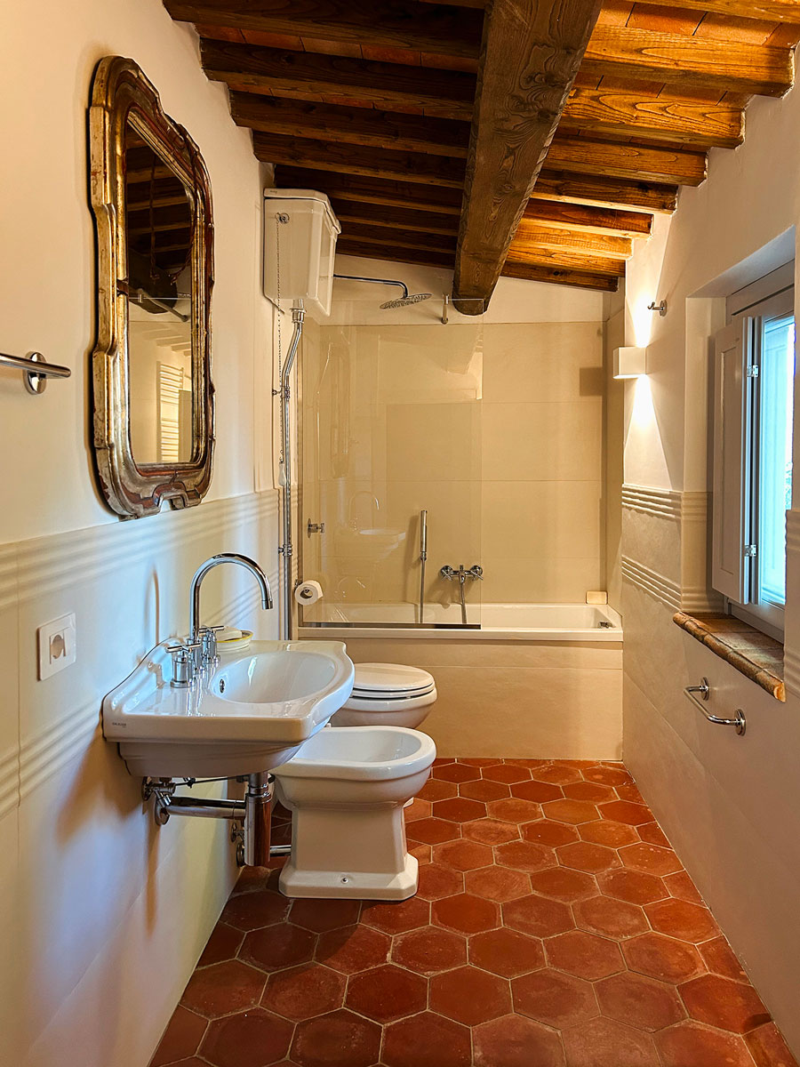 I bagni sono stati trasformati in veri e propri rifugi di eleganza e benessere, con l’utilizzo di lastre di marmo e particolari raffinati che esaltano la qualità e lo stile.